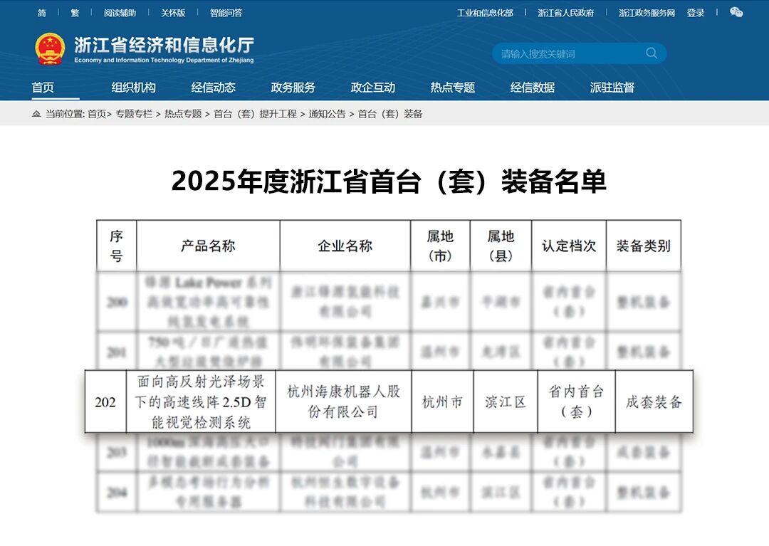 近日,浙江省经济和信息化厅公布2025年度浙江省首台(套)装备认定结果,海康机器人自主研发的 高速线阵2.5D智能视觉检测系统 成功入选,获省内首台(套)装备认定,标志着该装备在研发实力和技术创新方面的重大突破获得权威认可。