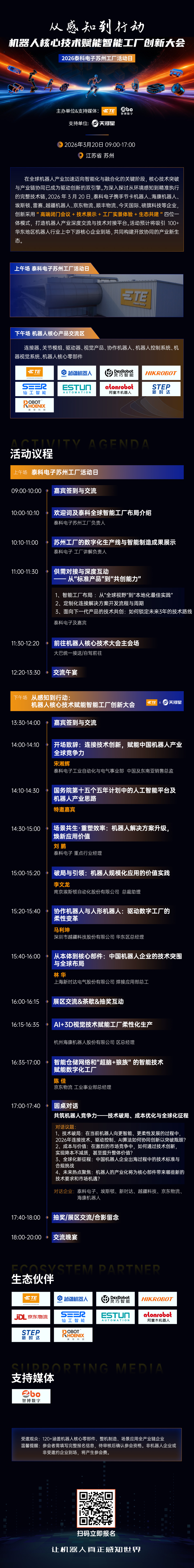 在全球机器人产业加速迈向智能化与融合化的关键阶段,核心技术突破与产业链协同已成为驱动创新的双引擎。为深入探讨从环境感知到精准执行的完整技术链,2026年3月20日,泰科电子携手海康机器人、埃斯顿、新时达、越疆机器人、顺丰物流、仙工智能、阿童木机器人、灵巧智能等企业,创新采用“高端闭门会议+技术展示+工厂实景体验+生态共建”四位一体模式,打造机器人产业深度交流与技术对接平台。活动预计将吸引100+华东地区机器人行业上中下游核心企业到场,共同构建开放协同的产业新生态。