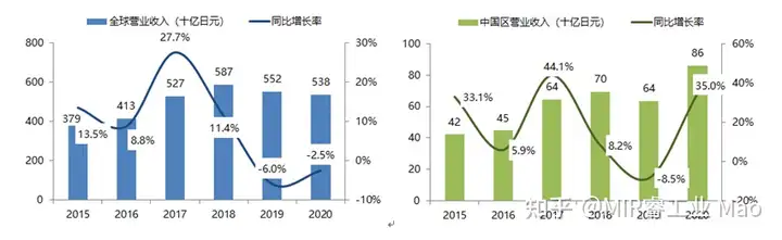 基恩士2020财年(2020年3月21日到2021年3月20日)全球营业收入约为538十亿日元(约316亿元人民币),同比下降2.5%,主要是因新冠肺炎感染的扩大,企业的设备投资欲望减弱,面向工厂自动化的产品销量陷入低迷。按地区来看,以中国为中心的亚洲地区疫情控制效果较好,经济迅速恢复,营业收入实现逆势增长,但未能弥补日本国内等其他海外地区的业绩低迷。