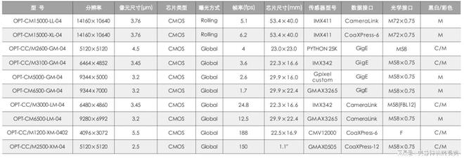 多种型号 全面覆盖OPT面阵系列工业相机拥有多款型号,产品覆盖30万到1.5亿像素,包括行曝光与帧曝光两种方式,满足您的不同需求。