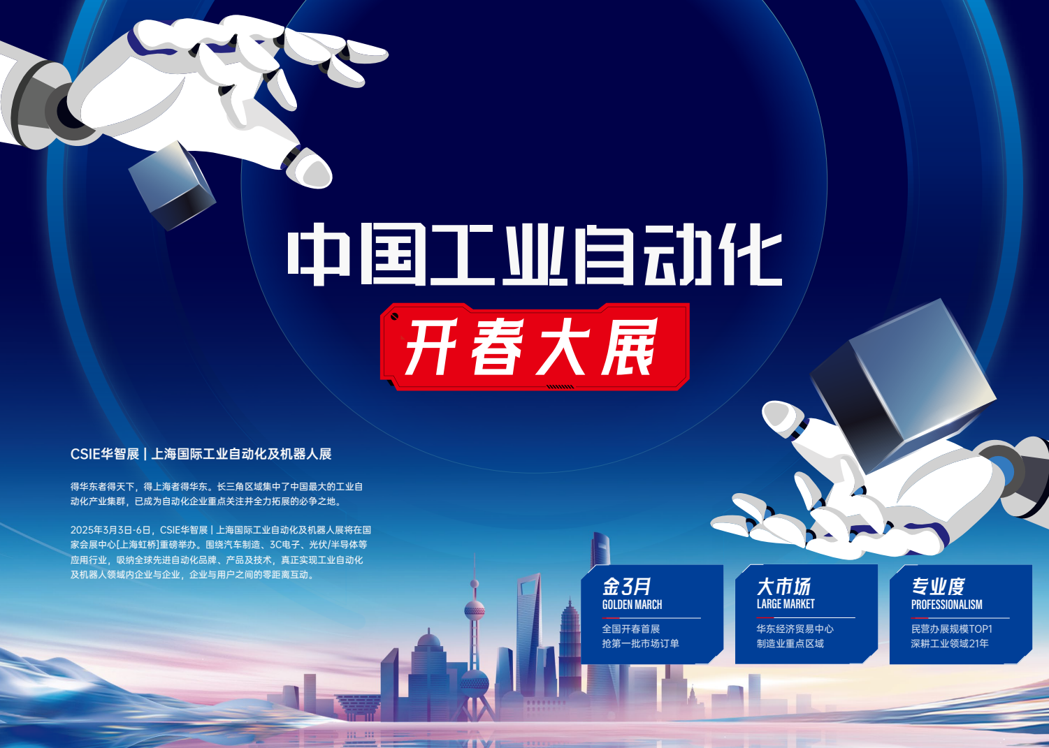 2025年3月3日-6日,CSIE华智展 | 上海国际工业自动化及机器人展将在国家会展中心[上海虹桥]重磅举办。围绕汽车制造、3C电子、光伏/半导体等应用行业,吸纳全球先进自动化品牌、产品及技术,真正实现工业自动化及机器人领域内企业与企业,企业与用户之间的零距离互动。