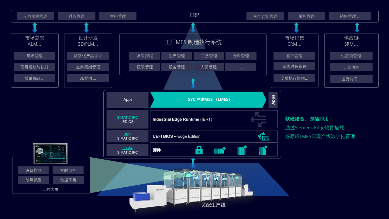 广州盛原成科技联合西门子工业边缘,打造产线MES解决方案,专门为高速自动柔性化生产线提供数字化生产管理系统,软硬结合,即插即用。盛原成产线MES系统能实现产线工位高速数据交互与数据管理,满足产线高节拍要求,单次任务时间低于300ms,并提供标准化功能模块,在应用层实现低代码,“拖拉拽”即可上手,轻松实现追溯,质量控制,工单管理等功能,高效交付功能强大且稳定的产线MES系统。
