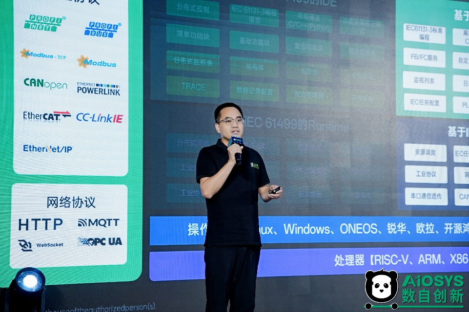 数自创新研发总监邹翔则详解了AIOSYS的架构与功能。AIOSYS整体架构涵盖通讯、安全、基础服务等部分,中间IEC61499部分为重点。IDE基于WEB技术,采用分布式微服务设计;运行时完全遵循IEC61499标准,融合IEC61131-3标准,支持主流协议与虚拟化。