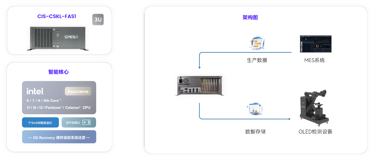 平板显示检测是平板显示器件生产各制程中的必备环节,主要在 LCD、OLED 以及TouchPanel 产品等平板显示器件的生产过程中进行光学、信号、电气性能等各种功能检测。为了实现 OLED 图像色度缺陷、微裂纹等快速精准检测,需要具备较强算力。SPES TECH 提供 CIS-CSKL-FAS1 3U桌面式箱体电脑作为 IPC 方案。