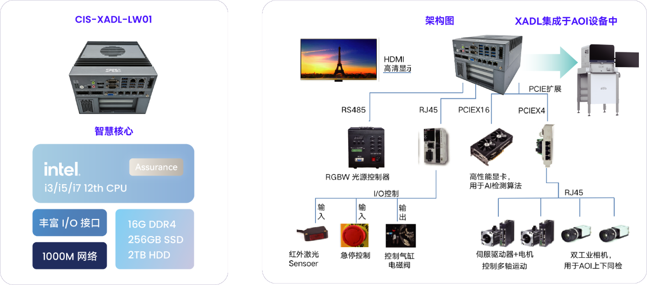 自动化光学检测(Automated Optical Inspection)是基于光学原理来对 PCBA 焊接生产中遇到的常见缺陷进行检测的设备,作为电子制造业确保产品质量的重要检测工具和过程质量控制工具,越来越多的企业选择以 AOI 代替人工检测。为保障在复杂工况条件下实现PCBA高效、快速、精准检测,需要具备强大的计算性能,同时也要具备较强扩展性以支持外接光源控制器、工业相机、伺服电机等多功能模块。SPES TECH 提供 CIS-XADL-LW01 可扩展式工业计算机作为 IPC 方案。