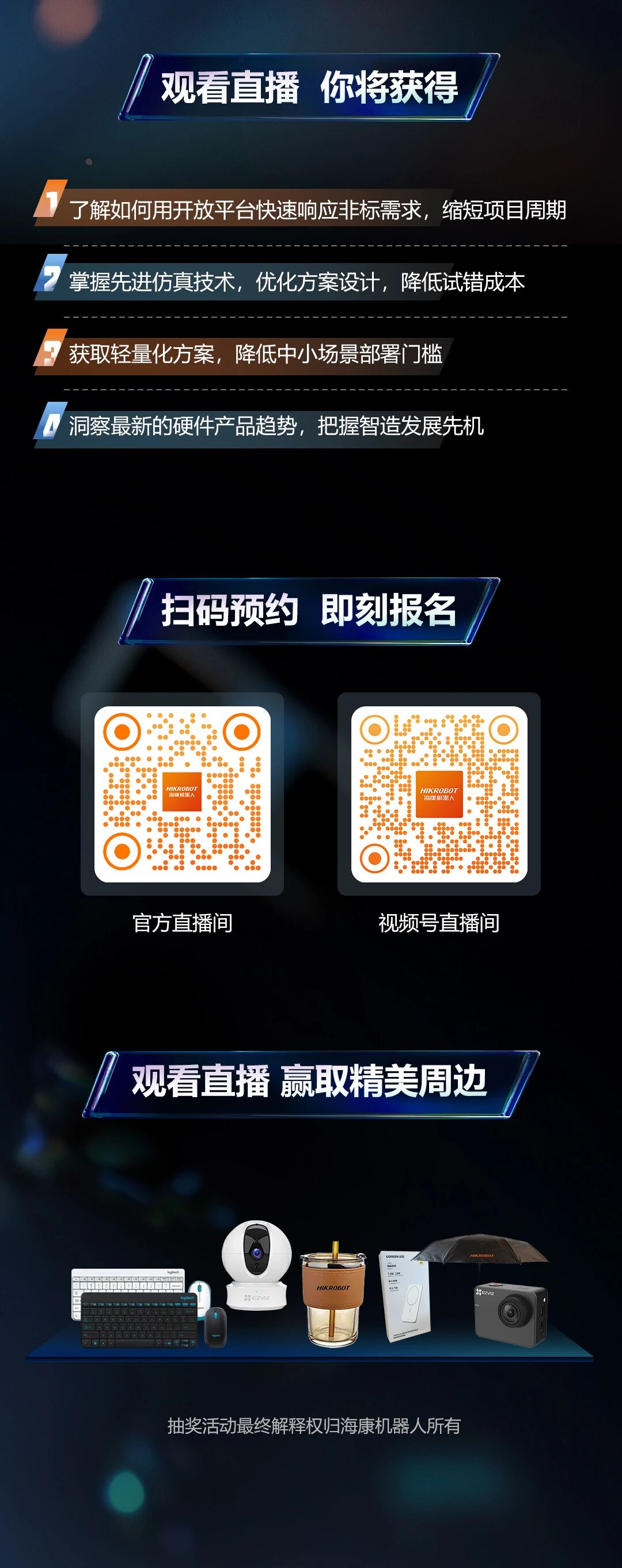 本次发布会将围绕生态产品与硬件产品,全方位展示海康机器人在移动机器人领域的最新突破与生态布局,同时还有技术专家在线答疑,观看直播更有机会赢取多种惊喜好礼,即刻预约吧!