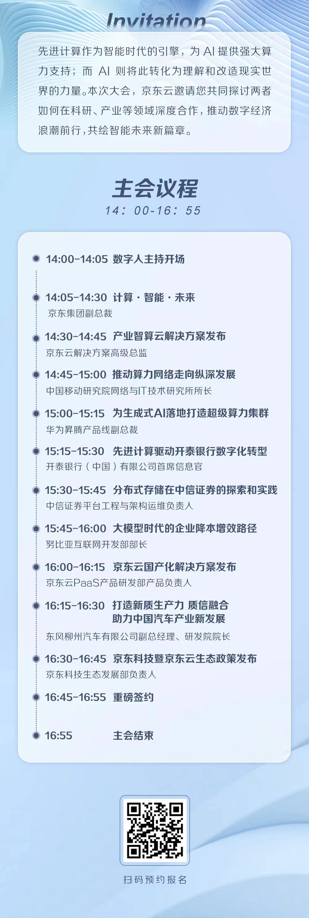 先进计算作为智能时代的引擎,为A!提供强大算力支持;而 Al则将此转化为理解和改造现实世界的力量。本次大会,京东云邀请您共同探讨两者如何在科研、产业等领域深度合作,推动数字经济浪潮前行,共绘智能未来新篇章。