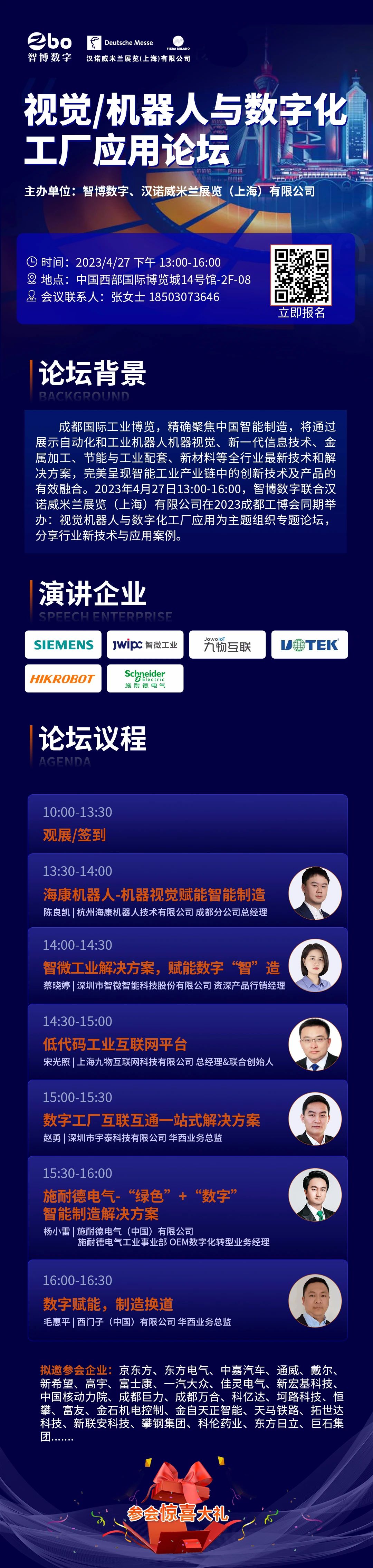 成都工博览会于4月26日-28日在中国西部国际博览城成功举办,本次展览会立足未来工业的高站位,精确聚焦中国智能制造,展示自动化和工业机器人技术、新一代信息技术等全行业最新技术和解决方案。4月27由智博数字联合汉诺威米兰展览(上海)有限公司共同主办了:以视觉/机器人与数字化工厂应用为主题的行业交流会。本次会议邀请到行业内资深的视觉、机器人、数字化工厂方案商企业代表,分享行业最新技术及其应用。