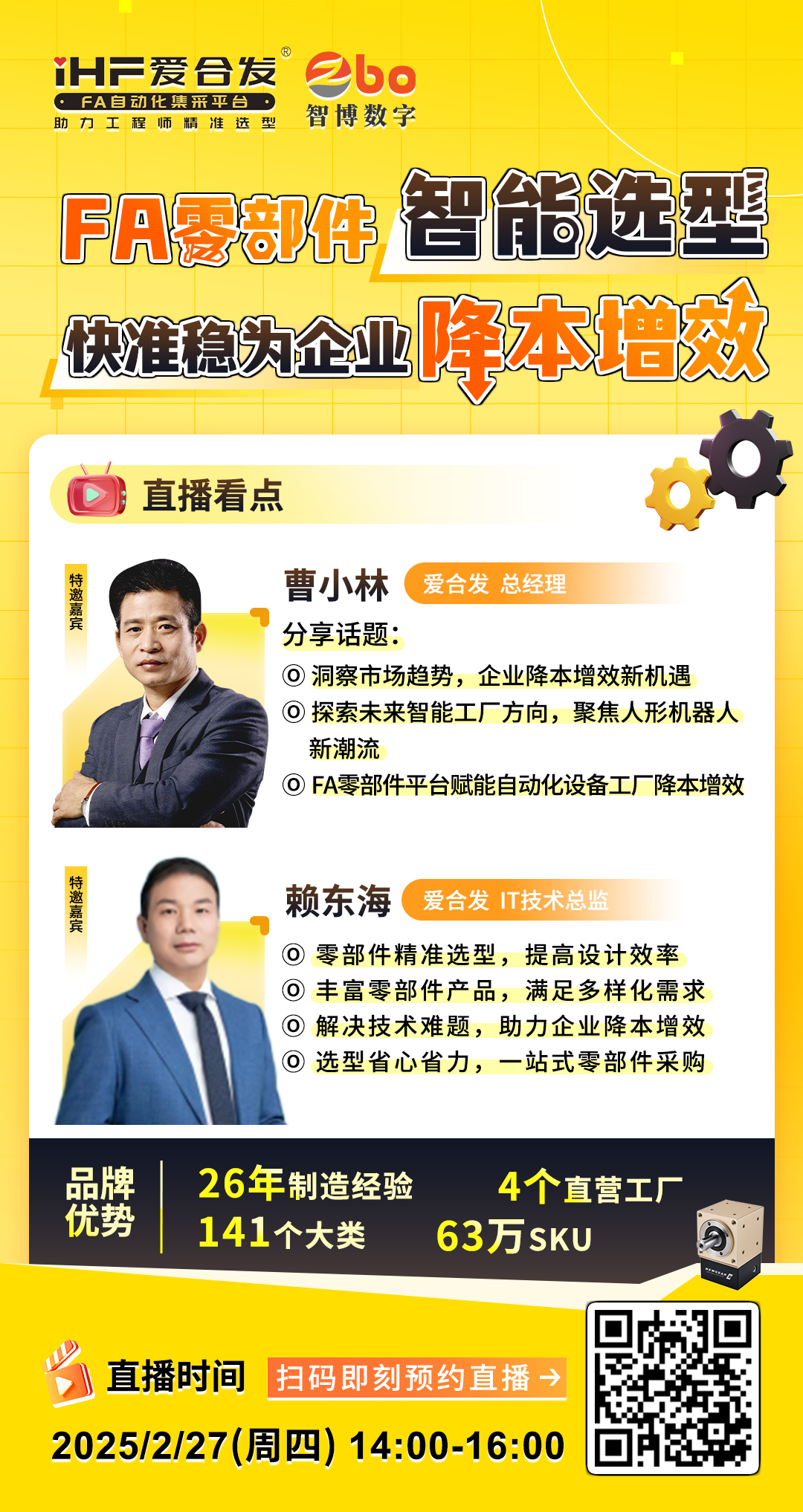依托智博数字平台与精准定向邀约,爱合发于2025年2月27日成功举办“FA零部件智能选型赋能智造升级”线上研讨会,吸引近千名工程师及企业代表云端共聚。通过在线弹幕实时互动、案例剖析等环节,围绕非标定制、库存优化等痛点展开热议,直播间热度持续爆棚,此次在线研讨会为制造业企业提供了从设计到交付的全链路降本增效方案,助力行业加速迈向智能化、精益化新阶段。