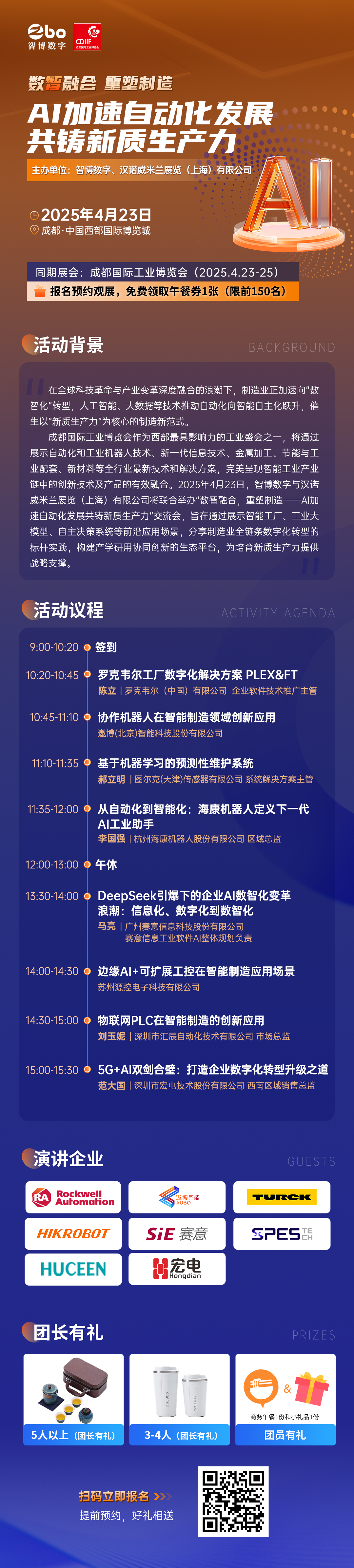 成都国际工业博览会作为西部最具影响力的工业盛会之一,将通过展示自动化和工业机器人技术、新一代信息技术、金属加工、节能与工业配套、新材料等全行业最新技术和解决方案,完美呈现智能工业产业链中的创新技术及产品的有效融合。2025年4月23日,智博数字与汉诺威米兰展览(上海)有限公司将联合举办“数智融合,重塑制造——AI加速自动化发展共铸新质生产力”交流会,旨在通过展示智能工厂、工业大模型、自主决策系统等前沿应用场景,分享制造业全链条数字化转型的标杆实践,构建产学研用协同创新的生态平台,为培育新质生产力提供战略支撑。