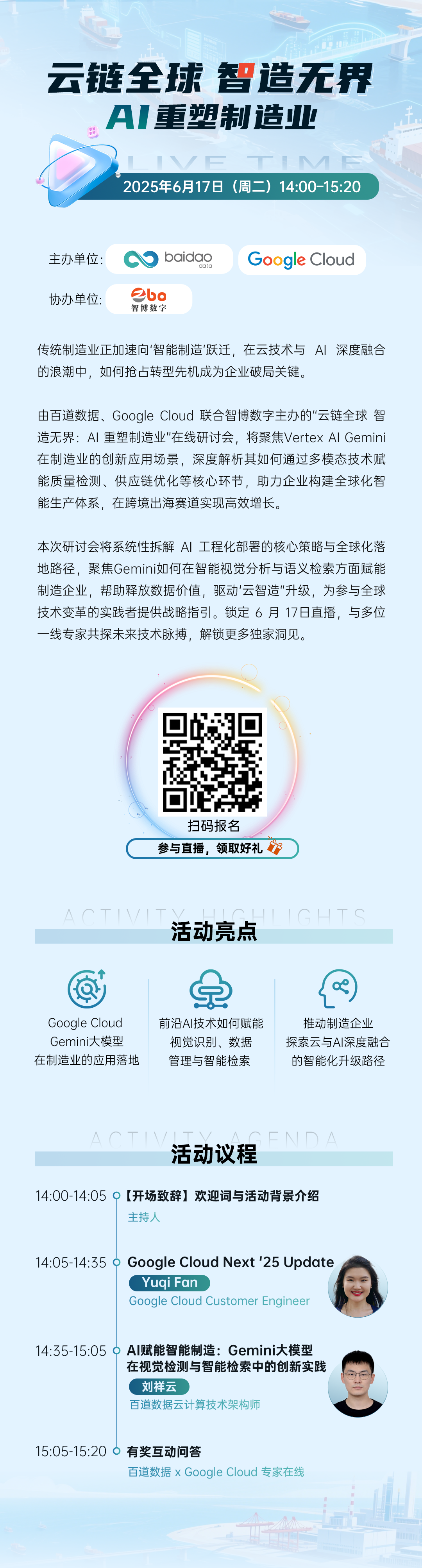 传统制造业正加速向‘智能制造’跃迁,在云技术与 AI 深度融合的浪潮中,如何抢占转型先机成为企业破局关键。 由百道数据、Google Cloud 联合智博数字主办的“云链全球 智造无界:AI 重塑制造业”在线研讨会,将聚焦Vertex AI Gemini 在制造业的创新应用场景,深度解析其如何通过多模态技术赋能质量检测、供应链优化等核心环节,助力企业构建全球化智能生产体系,在跨境出海赛道实现高效增长。 本次研讨会将系统性拆解 AI 工程化部署的核心策略与全球化落地路径,聚焦Gemini如何在智能视觉分析与语义检索方面赋能制造企业,帮助释放数据价值,驱动'云智造“升级,为参与全球技术变革的实践者提供战略指引。锁定 6 月 17日直播,与多位一线专家共探未来技术脉搏,解锁更多独家洞见。