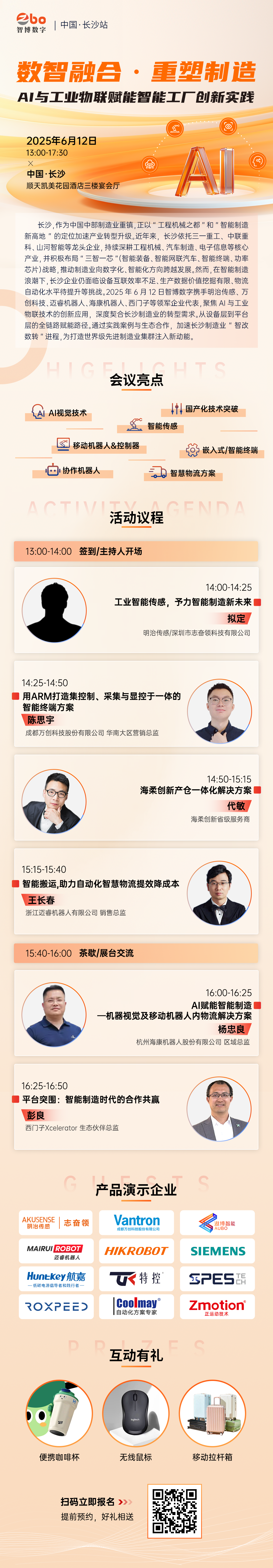 长沙,作为中国中部制造业重镇,正以"工程机械之都"和"智能制造新高地"的定位加速产业转型升级。近年来,长沙依托三一重工、中联重科、山河智能等龙头企业,持续深耕工程机械、汽车制造、电子信息等核心产业,并积极布局"三智一芯"(智能装备、智能网联汽车、智能终端、功率芯片)战略,推动制造业向数字化、智能化方向跨越发展。然而,在智能制造浪潮下,长沙企业仍面临设备互联效率不足、生产数据价值挖掘有限、物流自动化水平待提升等挑战。2025年6月12日智博数字携手万创科技、新松机器人、树根互联、迈睿机器人、海康机器人、西门子等领军企业代表,聚焦 A1与工业物联技术的创新应用,深度契合长沙制造业的转型需求。从设备层到平台层的全链路赋能路径。通过实践案例与生态合作,加速长沙制造业"智改数转"进程,为打造世界级先进制造业集群注入新动能。