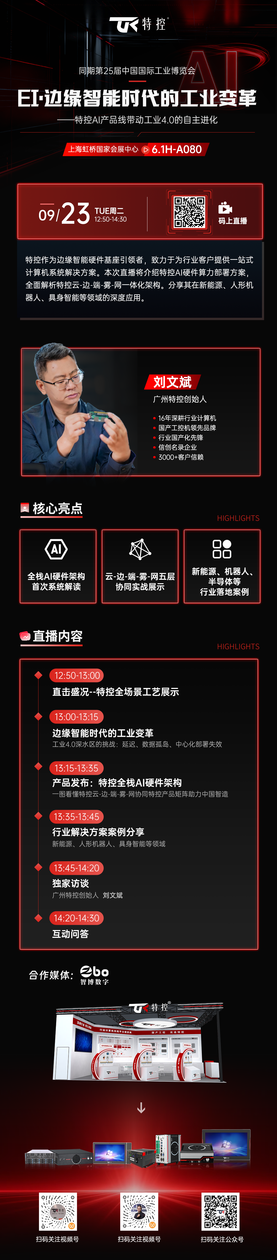 特控作为边缘智能硬件基座引领者,致力于为行业客户提供一站式计算机系统解决方案。本次直播将介绍特控AI硬件算力部署方案,全面解析特控云-边-端-雾-网一体化架构。分享其在新能源、人形机器人、具身智能等领域的深度应用。