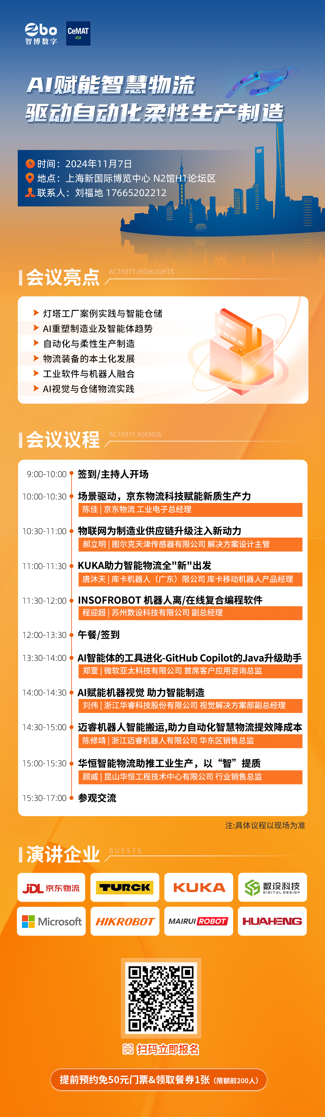 【AI赋能智慧物流,驱动自动化与柔性生产制造】论坛邀请到海尔卡奥斯,图尔克,库卡,数设科技,微软,海康机器人,浙江迈睿机器人,华恒等企业共同探讨灯塔工厂案例实践与智能仓储、AI重塑制造业及智能体趋势、自动化与柔性生产制造、物流装备的本土化发展、工业软件与机器人融合、AI视觉与仓储物流实践等核心技术的实际应用。