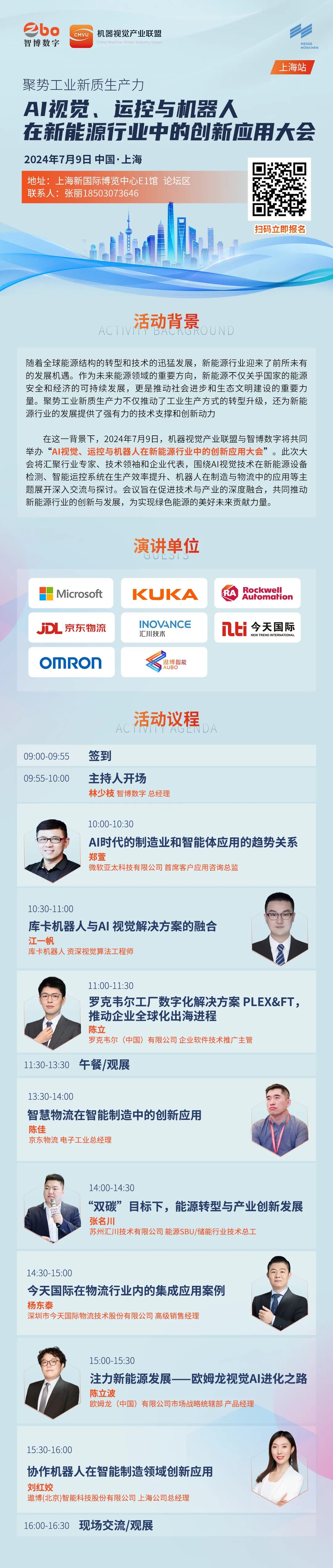 随着全球能源结构的转型和技术的迅猛发展,新能源行业迎来了前所未有的发展机遇。作为未来能源领域的重要方向,新能源不仅关乎国家的能源安全和经济的可持续发展,更是推动社会进步和生态文明建设的重要力量。聚势工业新质生产力不仅推动了工业生产方式的转型升级,还为新能源行业的发展提供了强有力的技术支撑和创新动力。2024年7月9日,机器视觉产业联盟与智博数字将共同举办“AI视觉、运控与机器人在新能源行业中的创新应用大会”,汇集各位业界专家、学者和从业者为我们带来全新的视角和启发,推动绿色制造的实现。