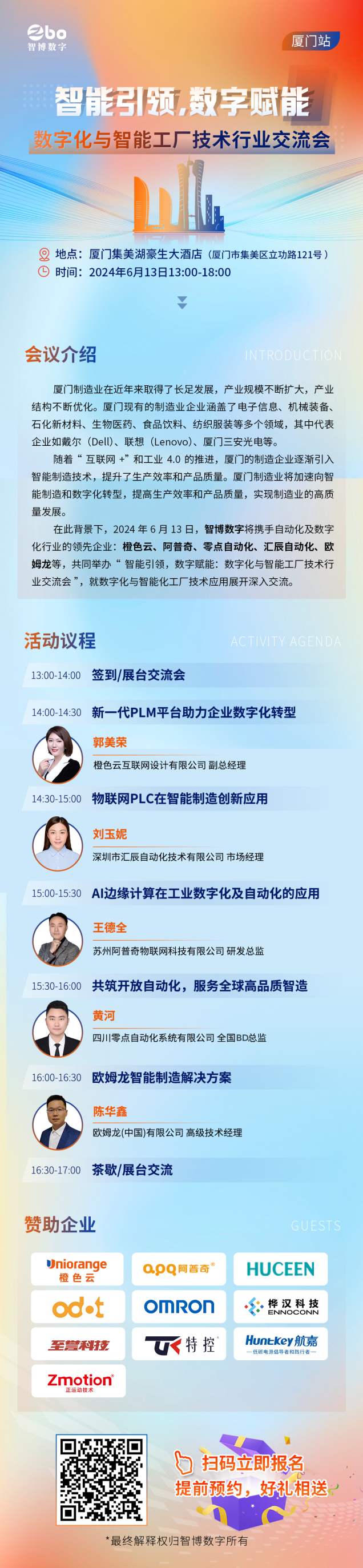 近年来厦门制造业取得了长足的发展,产业规模不断扩大,结构不断优化。在“互联网+”和工业4.0的推动下,制造企业正加速向智能制造和数字化转型,提高生产效率和产品质量,实现制造业的高质量发展。2024年6月13日,由智博数字携手橙色云、阿普奇、零点自动化、汇辰自动化、欧姆龙等领先企业的专家和代表,分享在数字化和智能工厂技术应用方面的最新成果和宝贵经验。