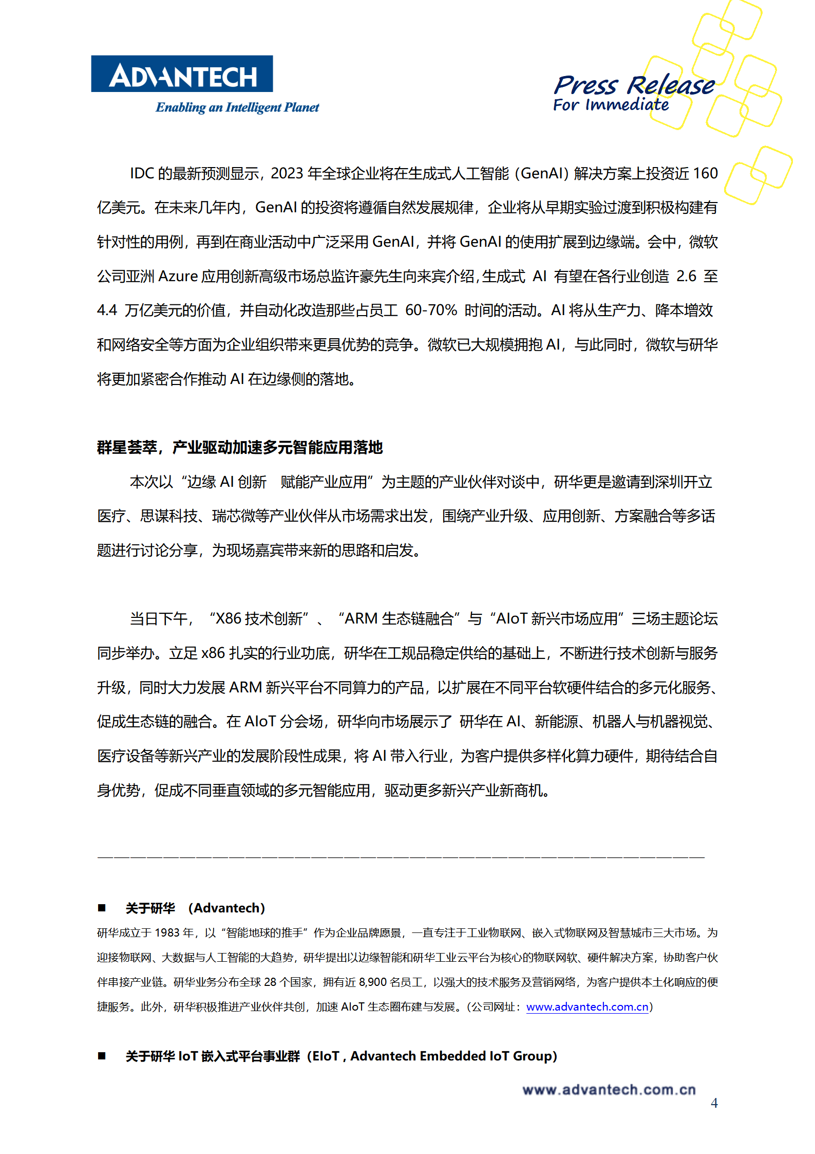 2023年10月19日,研华“嵌入式边缘运算产业伙伴峰会”于中国· 深圳举办。作为2023研华系列产业伙伴峰会的边缘运算专场,本次峰会以“嵌入式边缘运算新趋势 引爆新兴产业应用商机”为主题,与微软、AMD、Arm、QT、开立医疗、瑞芯微电子、思谋科技等多位伙伴共同围绕嵌入式边缘运算与AI技术如何助力产业升级拓展新兴产业商机进行分享与讨论。