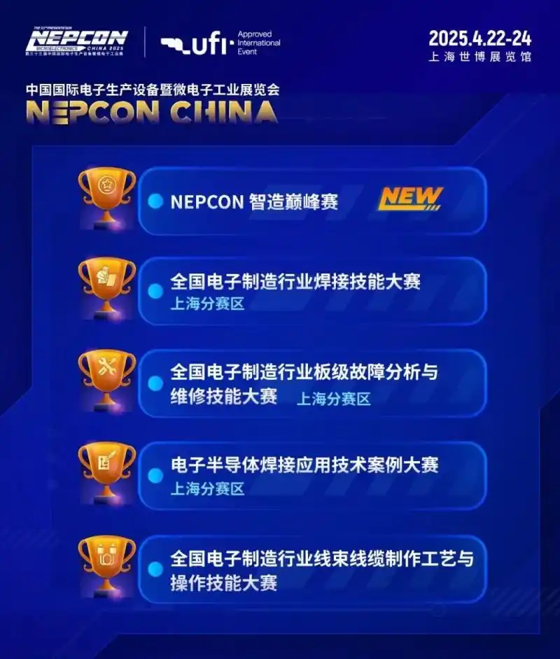 届时一系列电子制造赛事活动将轮番登场,从NEPCON智造巅峰赛,精细入微的电路板焊接,到精准高效的板级故障分析与维修,再到工艺繁杂的线束线缆制作,乃至对技术要求极高的电子半导体焊接比赛,为行业选手及精英搭建展示精湛技艺与优秀案例分享的绝佳学习交流平台,推动行业技术进步,为电子制造带来无限惊喜与突破!