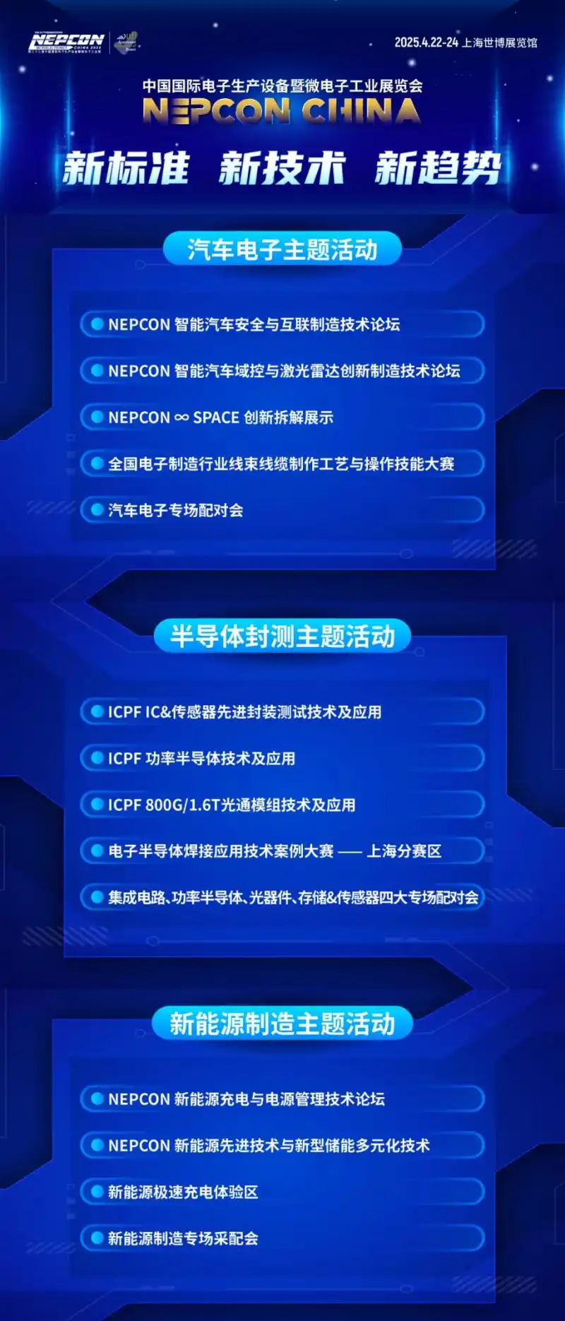 紧抓行业脉搏,NEPCON China 2025 保持敏锐,以“创新展示+会议+比赛+专场对接会”的多元形式,垂直打造三大高增长行业——汽车电子、半导体封测以及新能源制造主题活动,分享电子制造技术在不同领域应用与未来发展,为广大观众呈现行业的新标准、新技术、新方案。