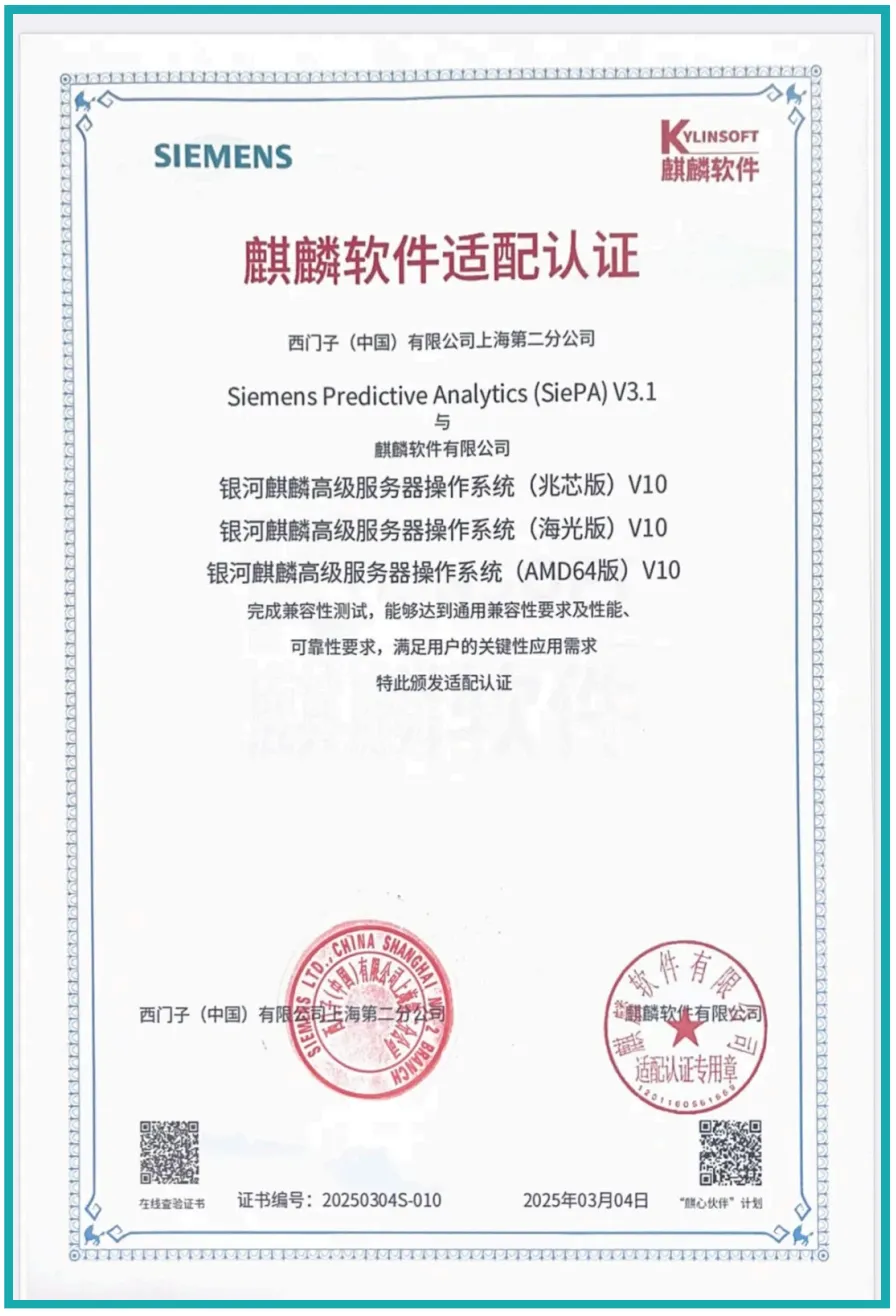 近日,西门子预测性分析系统Siemens Predictive Analytics(SiePA)V3.1成功通过麒麟操作系统适配认证,标志着SiePA在本土操作系统安全性方面迈上新台阶,测试结果表明,SiePA在功能和兼容性等方面均表现优秀,已全面适配国产操作系统,可以满足工业企业关键应用需求。