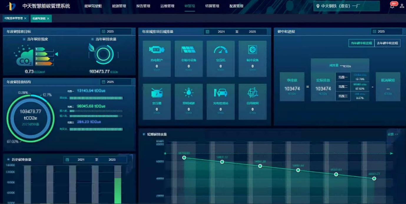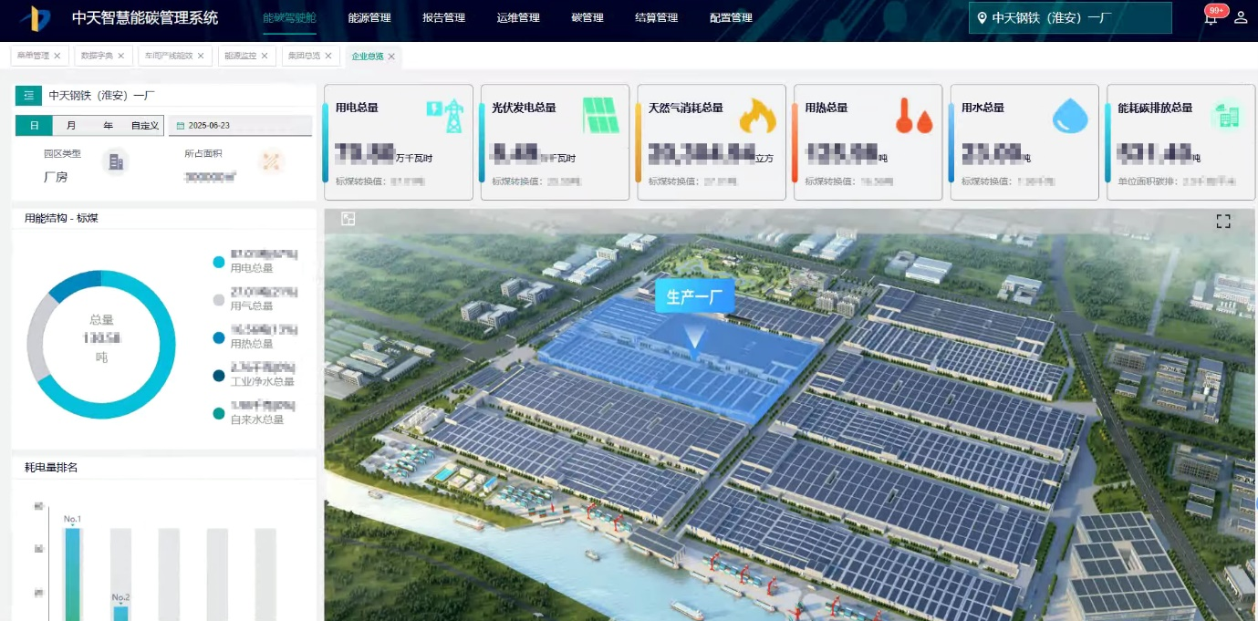 近年来,在中天钢铁集团持续推进特钢产业链固链、延链和强链的战略下,这一计划年产 160 万吨超高强精品钢帘线项目,主要面向全球轮胎品牌商提供汽车子午线轮胎骨架材料,计划在这里建设 6 个生产分厂、技术研发中心、智能装备中心和客服中心等,预计 2026 年项目达产后,约占全球 30%、国内 50% 以上钢帘线产能规模。更重要的是,围绕中天钢铁集团“全球金属材料深加工领域灯塔工厂”的定位目标,中天淮安在行业内率先全面推动 5G+AI+IoT 技术融合创新,构建起覆盖研发、生产、物流、管理的全流程智能制造体系。在全面建成这一“灯塔工厂”的宏大进程中,与西门子联手打造的智慧能碳管理系统,成为灯塔工厂塔尖上的一颗绿色“明珠”。