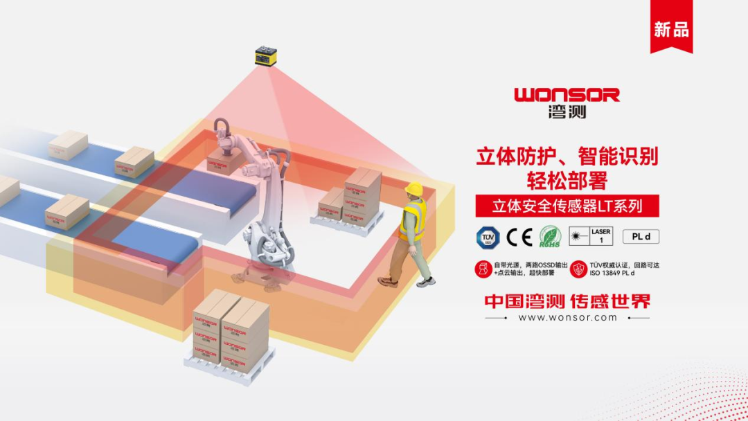 湾测立体安全传感器,搭载AI算法并通过TÜV认证,回路安全等级可达PLd,有效弥补人机协作场景下传统防护手段的不足,能精准感知人员位置、距离和姿态,当人员闯入或异常逗留时,立即输出报警信号,实时监测防护区域,保障人员安全。