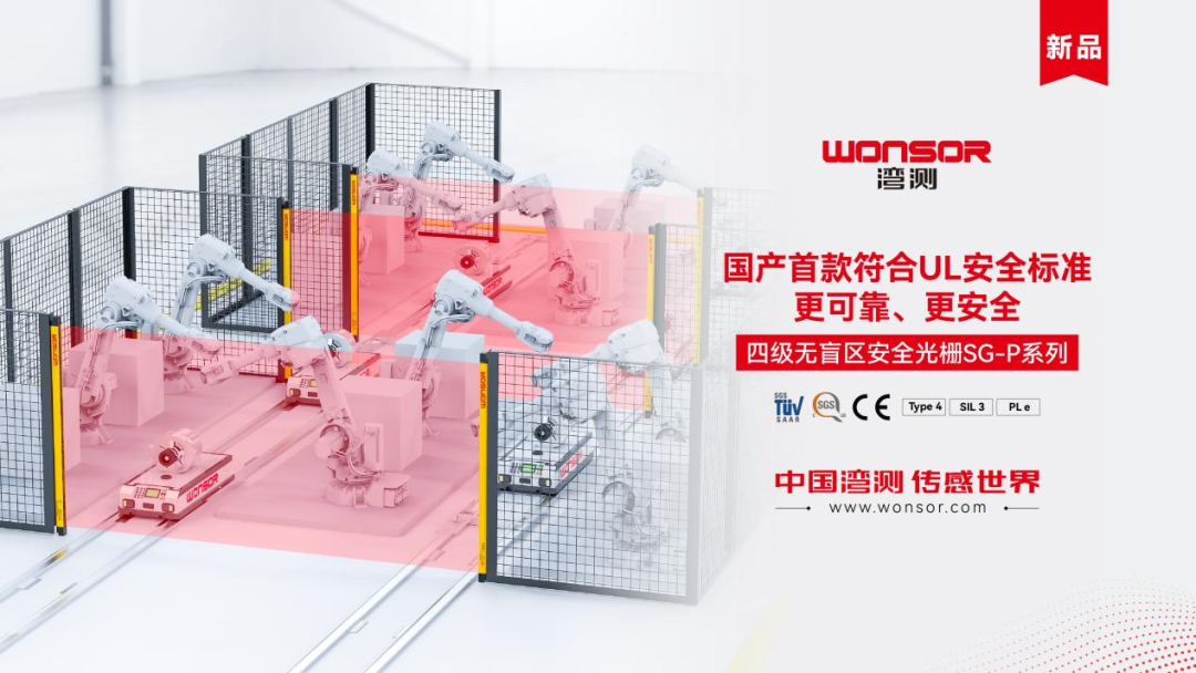 国产首款符合UL安全标准并通过IEC 61508(SIL 3)功能安全认证的四级无盲区安全光栅,湾测SG-P系列集三重认证于一身,高效满足全球安全标准要求,为智能制造企业破除贸易技术壁垒,实现「合规出海一步到位」。