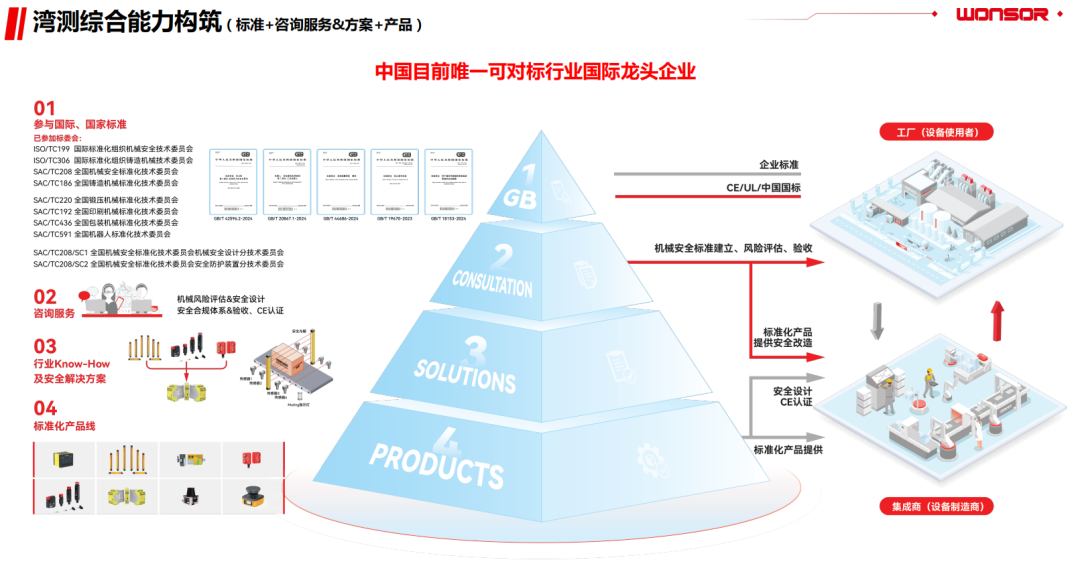 作为 TC208 副秘书长成员单位,湾测深度参与国际与国家工业安全标准体系建设,已发布 9 项工业安全领域相关标准,构建起 “标准化产品 + 安全解决方案 + 咨询服务” 的综合能力体系,为工厂及设备制造商提供从风险评估、安全设计到验收认证的全流程支持。